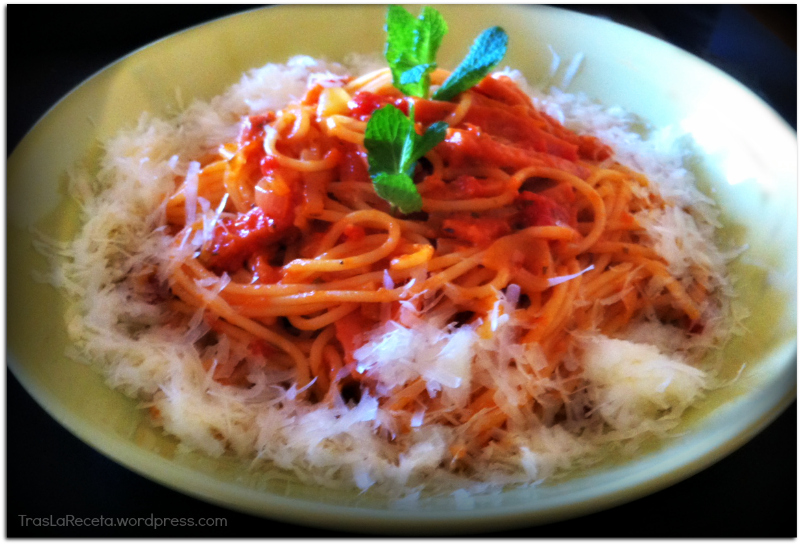 spaghetti con salsa de tomate, cebolla y chopped beef 2