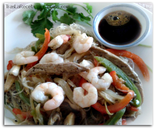 vermicelli salteados con verduras, ternera, gambas y salsa de cilantro