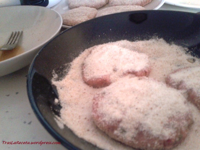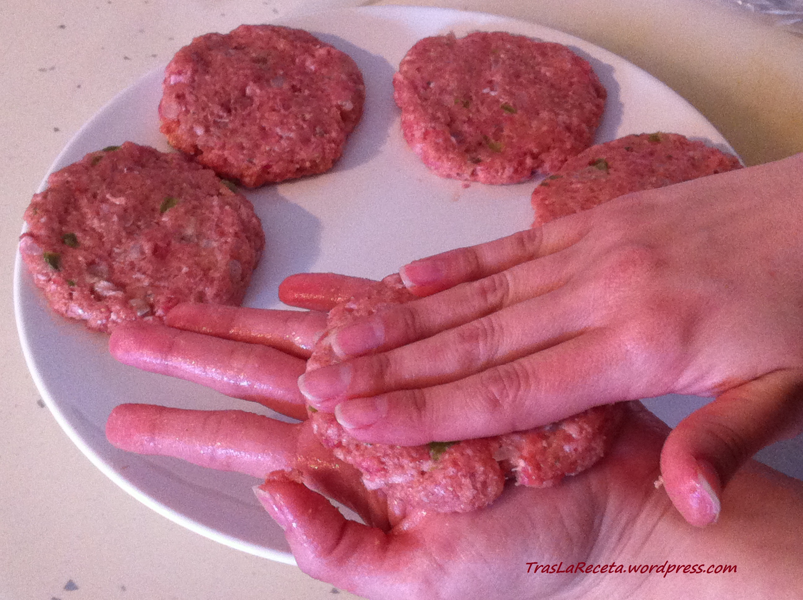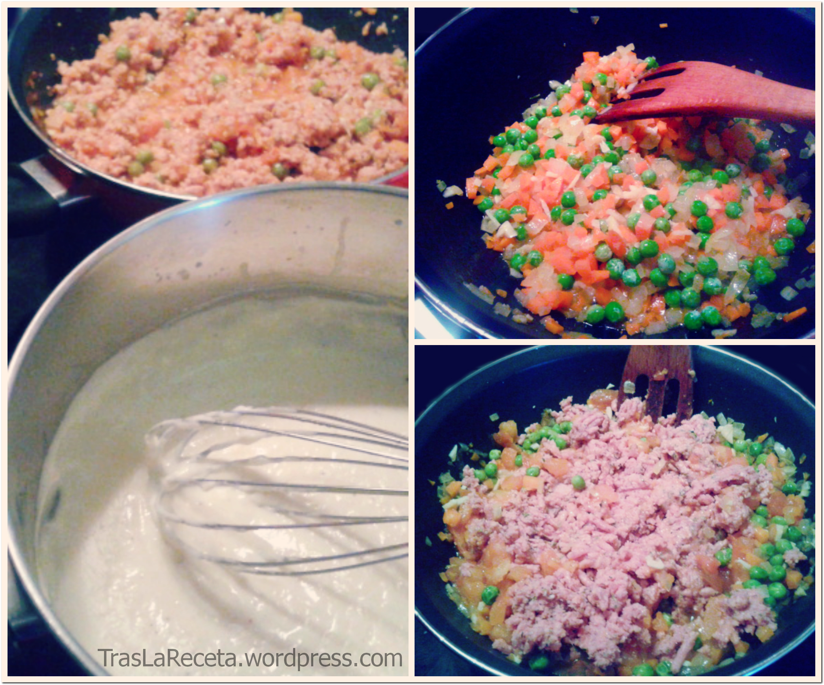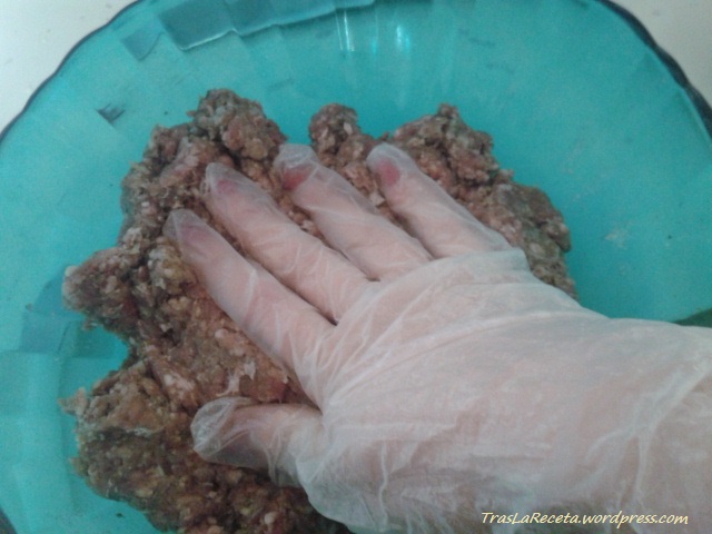 - Echa la carne sazonada a la cazuela o sartén (asegúrate de utilizar una que puedas tapar más tarde) con la cebolla y los pimientos, desbarata bien la carne, mezclando todo muy bien y deja que se dore toda, para ello remueve cada rato, esto te llevará unos 5 a 8 minutos a fuego vivo pero no demasiado alto.
