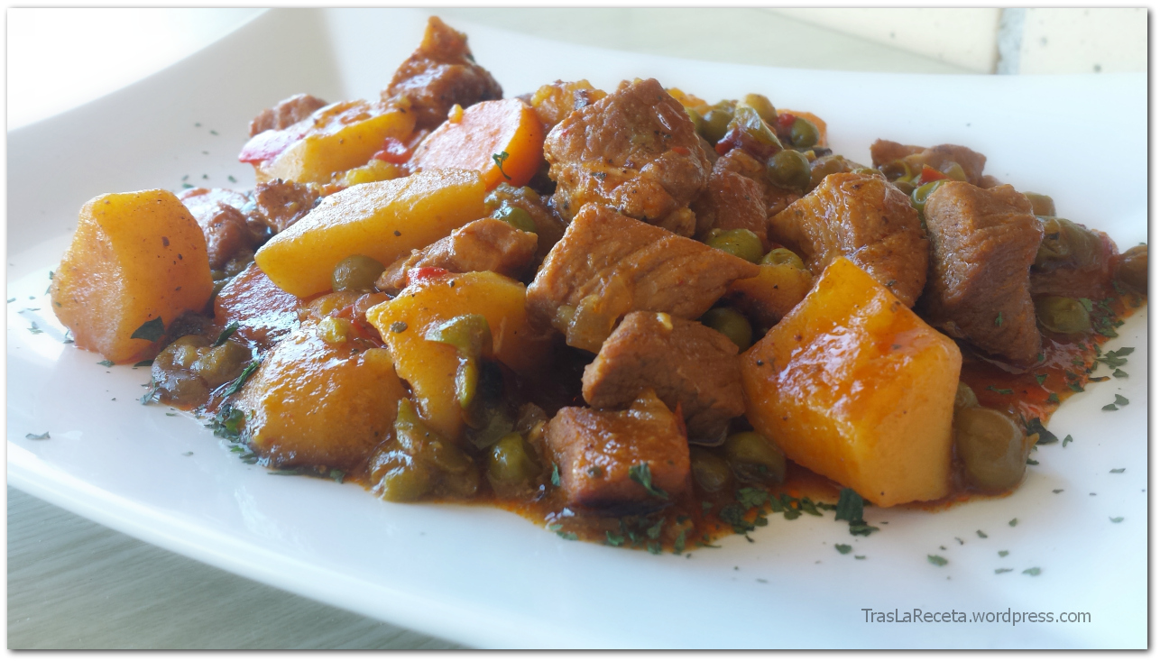 La receta clásica de ragout de ternera no lleva patatas, pero esta versión con magro de cerdo que traigo hoy, llámese ragout o fricasé como en Cuba, va justo como más gusta en casa, con unas «papas» de guarnición cortadas en cachelos para que aporten a la salsa de este tipo de guisos el espesor y sabor más pronunciados. La zanahoria, los guisantes y tomates del ragout italiano tampoco faltan a esta receta, la cual podréis disfrutar con un arroz blanco desgranado o un buen trozo de pan para rebañar en la salsa. Es un plato de cuchara pero que podemos compartir también este verano con una cerveza bien fría o un vino fresquito.